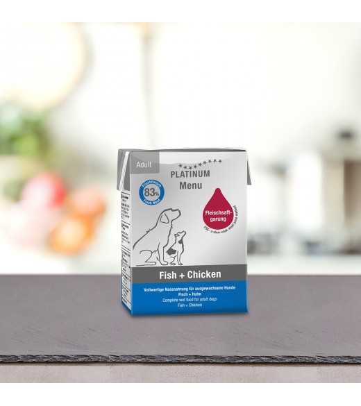 PLATINUM Menu Fisk og Kylling er et velsmagende vådfoder til hunde, lave med 83% frisk kylling(57%) og fisk(26%). Kødet er nænsomt kogt i sin egen saft - uden tilsat vand. Den skånsomme tilberedningsproces og de nøje udvalgte ingredienser giver et måltid der smager godt og dækker din hunds ernæringsmæssige behov.